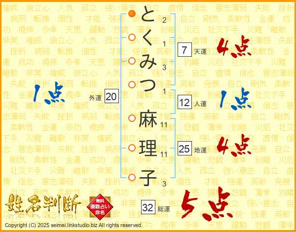 と(2画)く(1画)み(3画)つ(1画) 麻(11画)理(11画)子(3画)