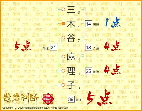 三(3画)木(4画)谷(7画) 麻(11画)理(11画)子(3画)