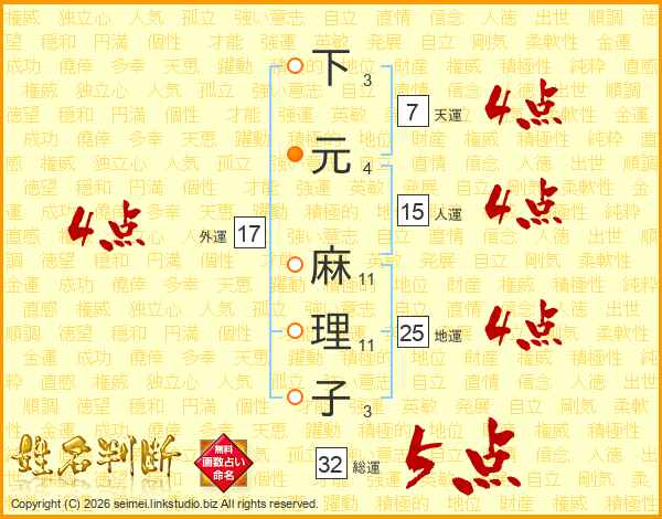 下(3画)元(4画) 麻(11画)理(11画)子(3画)