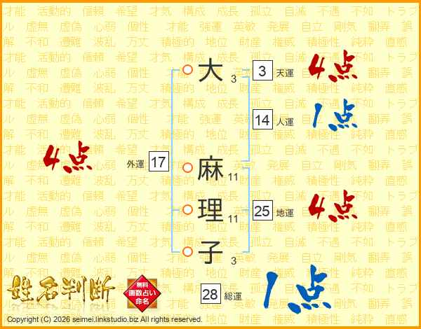 大(3画) 麻(11画)理(11画)子(3画)