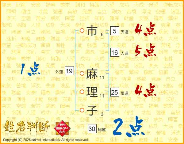 あなたの人生を表す1番重要な運勢です。生涯を通じて影響する総合運となり、主に50歳以降の晩年期に影響を及ぼします。苗字と名前の合計画数。