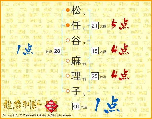 松(8画)任(6画)谷(7画) 麻(11画)理(11画)子(3画)