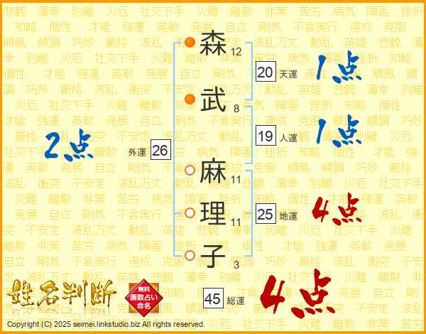 森(12画)武(8画) 麻(11画)理(11画)子(3画)