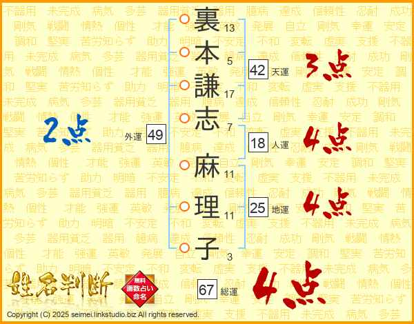 裏(13画)本(5画)謙(17画)志(7画) 麻(11画)理(11画)子(3画)