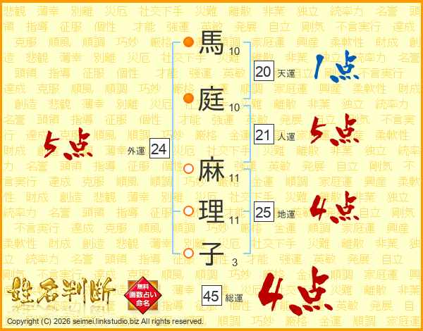 馬(10画)庭(10画) 麻(11画)理(11画)子(3画)