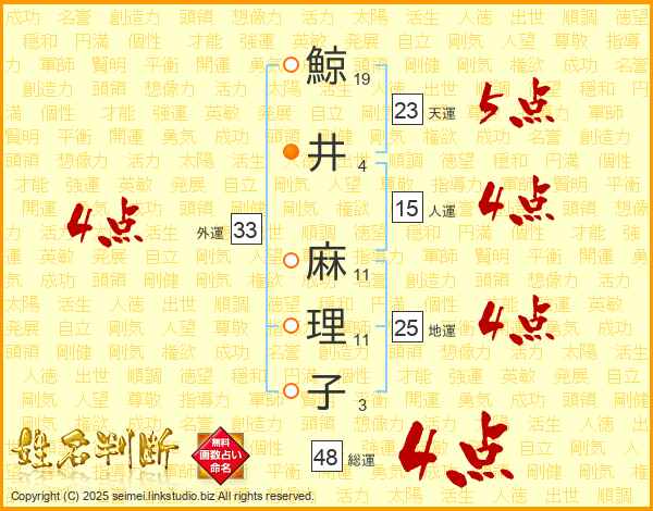 鯨(19画)井(4画) 麻(11画)理(11画)子(3画)