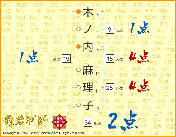 木(4画)ノ(1画)内(4画) 麻(11画)理(11画)子(3画)