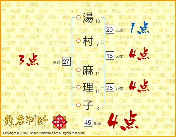 湯(13画)村(7画) 麻(11画)理(11画)子(3画)