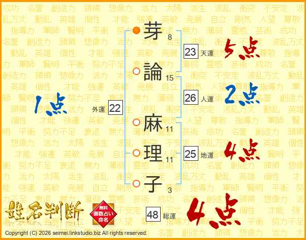 芽(8画)論(15画) 麻(11画)理(11画)子(3画)