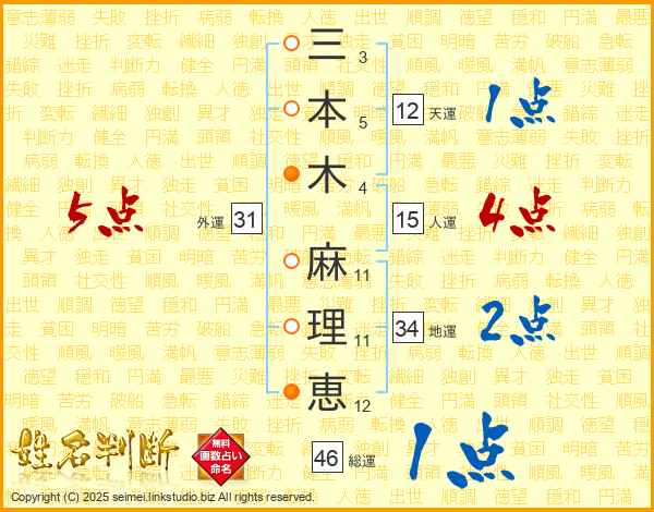 三(3画)本(5画)木(4画) 麻(11画)理(11画)恵(12画)