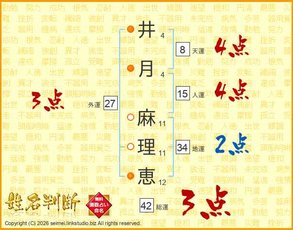 井(4画)月(4画) 麻(11画)理(11画)恵(12画)