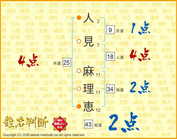 人(2画)見(7画) 麻(11画)理(11画)恵(12画)