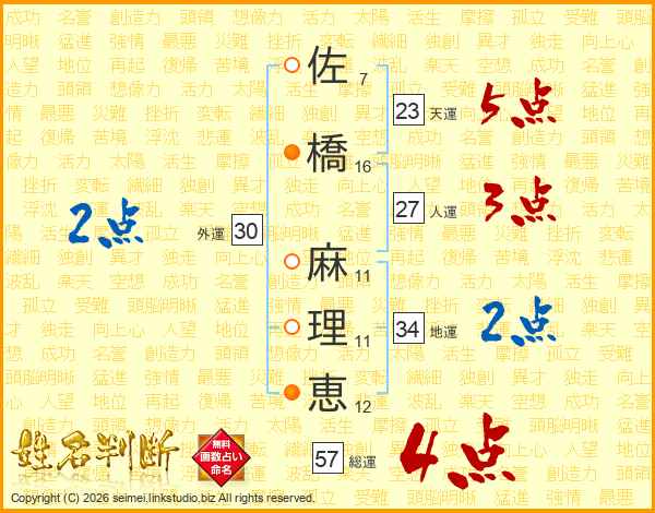 佐(7画)橋(16画) 麻(11画)理(11画)恵(12画)