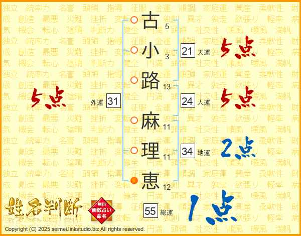 古(5画)小(3画)路(13画) 麻(11画)理(11画)恵(12画)