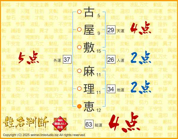 古(5画)屋(9画)敷(15画) 麻(11画)理(11画)恵(12画)