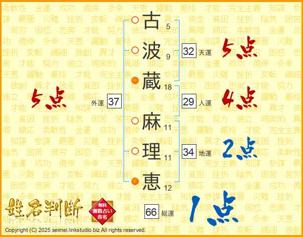 古(5画)波(9画)蔵(18画) 麻(11画)理(11画)恵(12画)