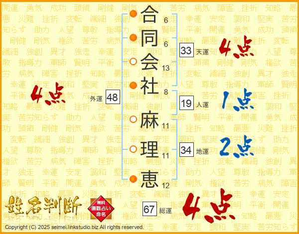 合(6画)同(6画)会(13画)社(8画) 麻(11画)理(11画)恵(12画)