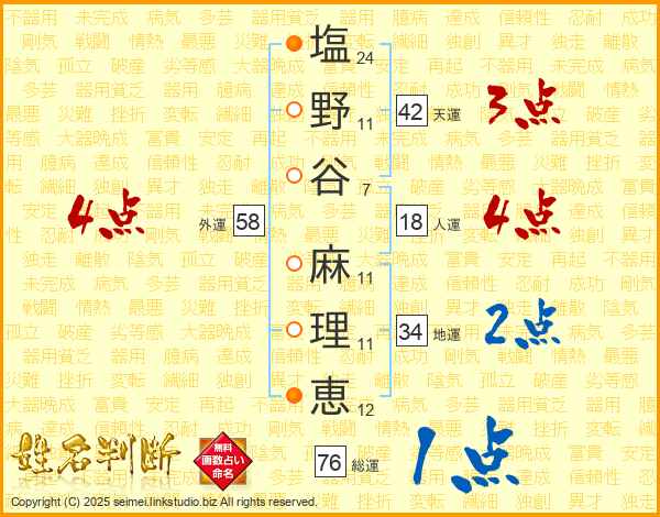 塩(24画)野(11画)谷(7画) 麻(11画)理(11画)恵(12画)