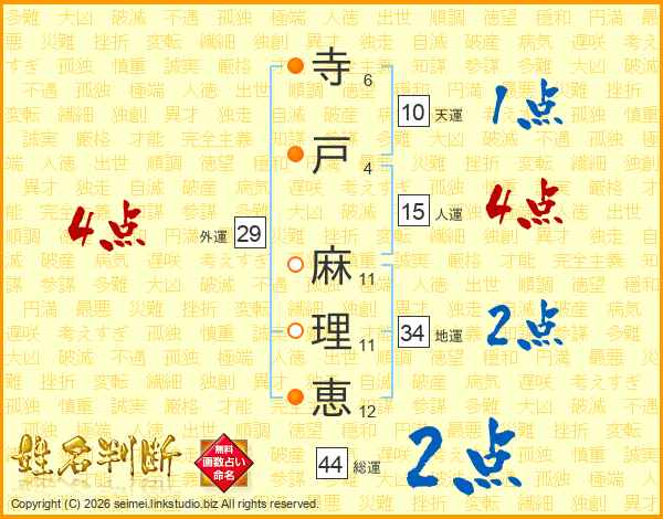 寺(6画)戸(4画) 麻(11画)理(11画)恵(12画)