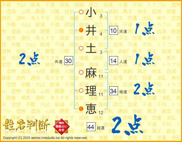 小(3画)井(4画)土(3画) 麻(11画)理(11画)恵(12画)