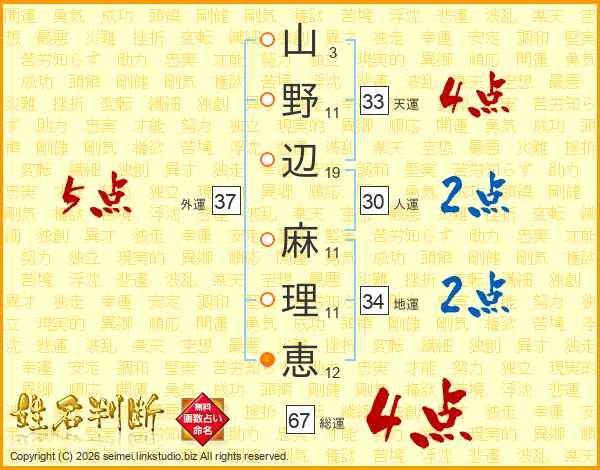 山野辺麻理恵さんの総運は67画の4点!