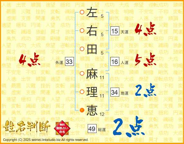 左(5画)右(5画)田(5画) 麻(11画)理(11画)恵(12画)