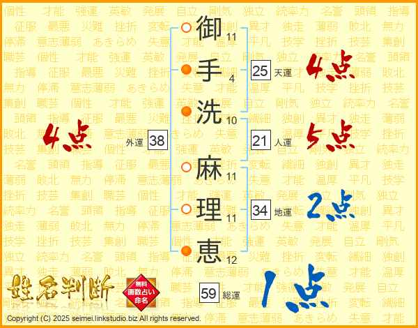 御(11画)手(4画)洗(10画) 麻(11画)理(11画)恵(12画)