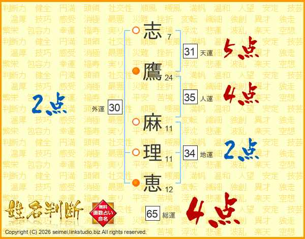 志(7画)鷹(24画) 麻(11画)理(11画)恵(12画)