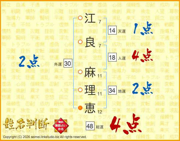 江(7画)良(7画) 麻(11画)理(11画)恵(12画)