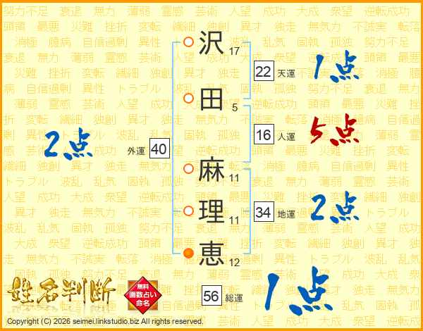 沢(17画)田(5画) 麻(11画)理(11画)恵(12画)
