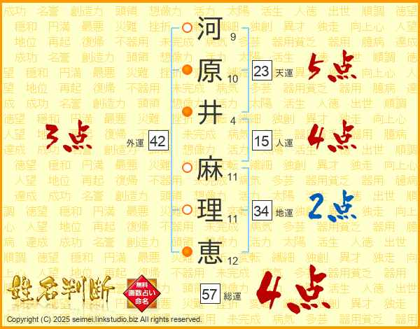 河(9画)原(10画)井(4画) 麻(11画)理(11画)恵(12画)