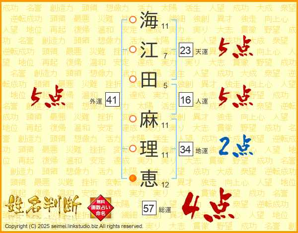 海(11画)江(7画)田(5画) 麻(11画)理(11画)恵(12画)