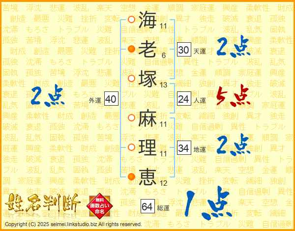 海(11画)老(6画)塚(13画) 麻(11画)理(11画)恵(12画)