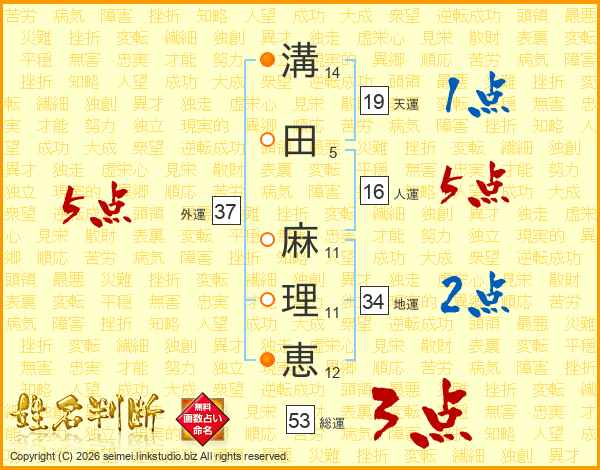 溝(14画)田(5画) 麻(11画)理(11画)恵(12画)