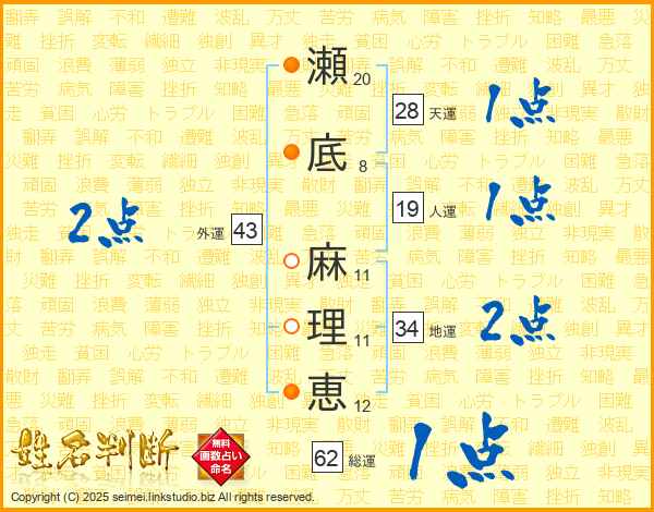 瀬(20画)底(8画) 麻(11画)理(11画)恵(12画)