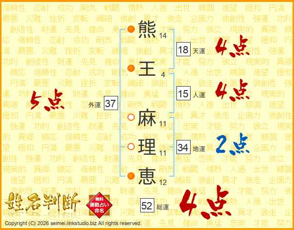 熊(14画)王(4画) 麻(11画)理(11画)恵(12画)