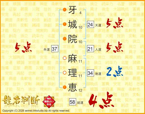 牙(4画)城(10画)院(10画) 麻(11画)理(11画)恵(12画)