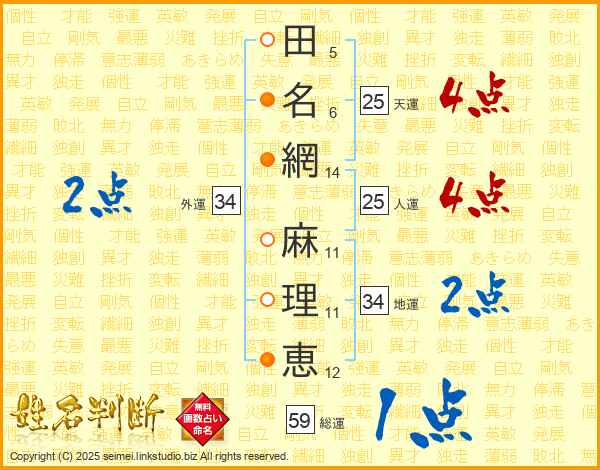 田(5画)名(6画)網(14画) 麻(11画)理(11画)恵(12画)