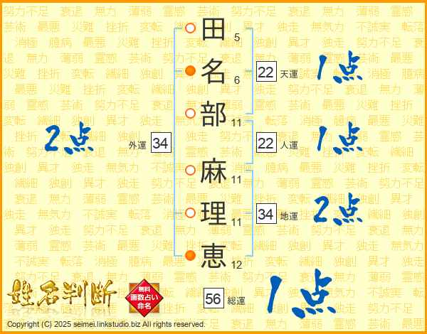 田(5画)名(6画)部(11画) 麻(11画)理(11画)恵(12画)