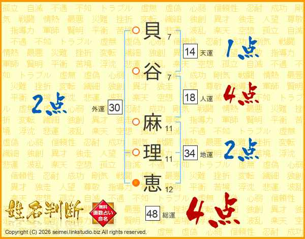 貝(7画)谷(7画) 麻(11画)理(11画)恵(12画)