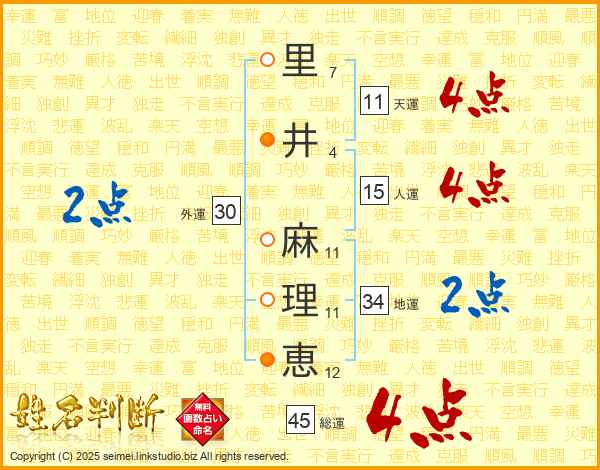 里(7画)井(4画) 麻(11画)理(11画)恵(12画)