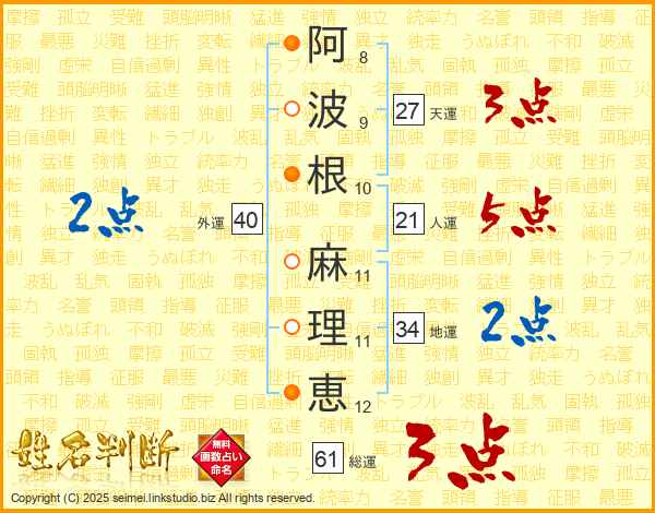 阿(8画)波(9画)根(10画) 麻(11画)理(11画)恵(12画)