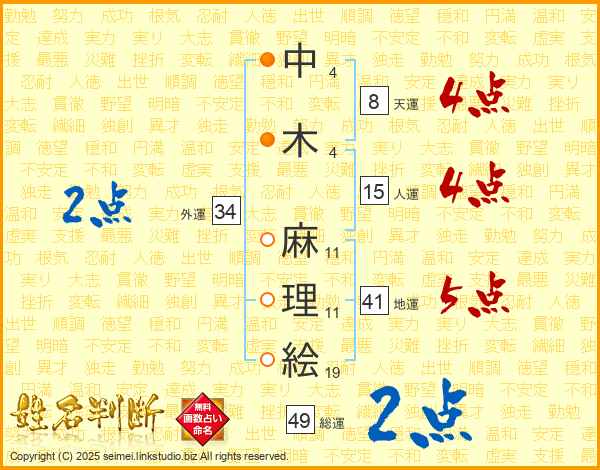 中(4画)木(4画) 麻(11画)理(11画)絵(19画)