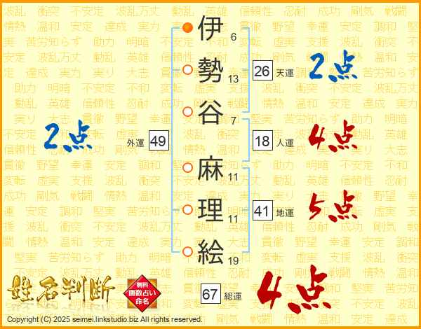 伊(6画)勢(13画)谷(7画) 麻(11画)理(11画)絵(19画)