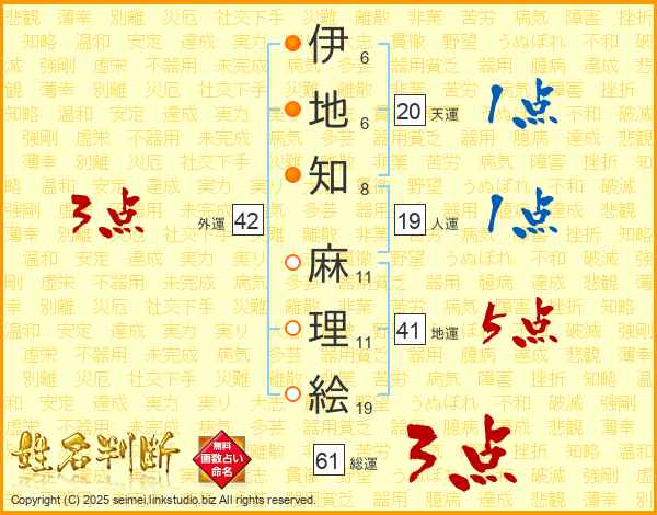 伊(6画)地(6画)知(8画) 麻(11画)理(11画)絵(19画)