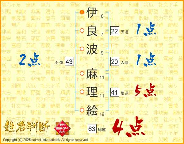 伊(6画)良(7画)波(9画) 麻(11画)理(11画)絵(19画)