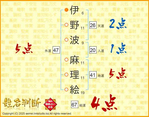 伊(6画)野(11画)波(9画) 麻(11画)理(11画)絵(19画)