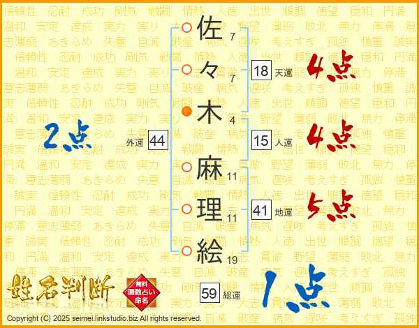 佐々木麻理絵さんの地運は41画の5点!