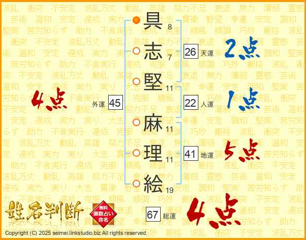 具(8画)志(7画)堅(11画) 麻(11画)理(11画)絵(19画)
