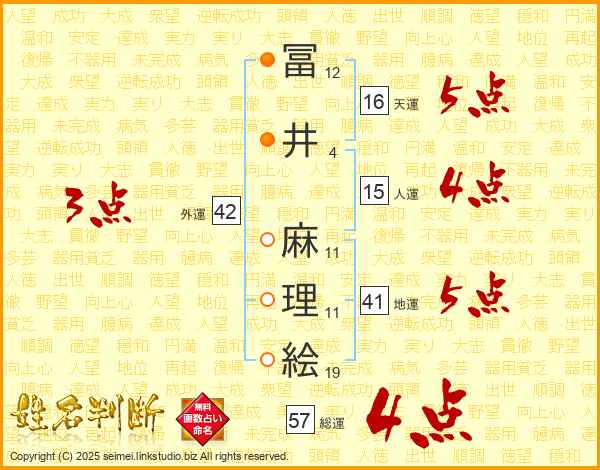 冨(12画)井(4画) 麻(11画)理(11画)絵(19画)